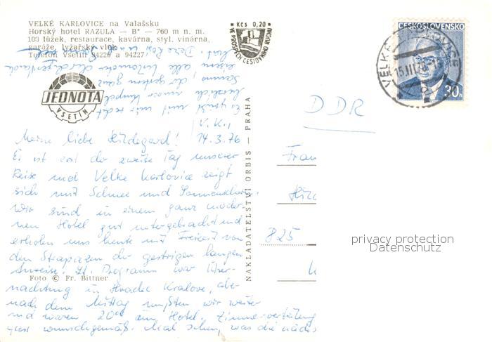 73852281 Velke Karlovice CZ Hotel Razula Winterlandschaft postalisch gelaufen Erhaltung siehe scans [FriedD77] old postcard Frie Katcode 11520