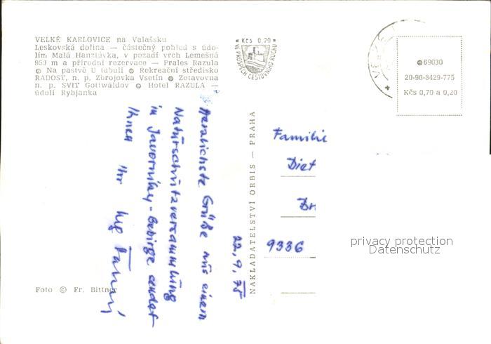 Velke Karlovice Leskovska dolina Mala Hanzluvka Lemesna Prales Razula Rekreacni stredisko Radost Zotavovna SVIT Gottwaldov Hotel Razula postalisch nicht gelaufen Erhaltung siehe scans