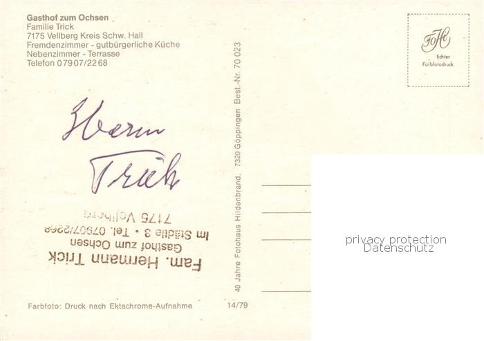 73866541 alte Postkarte Vellberg Gasthof zum Ochsen postalisch gelaufen Erhaltung siehe scans [WerneD78] KatCode: 11110008127089