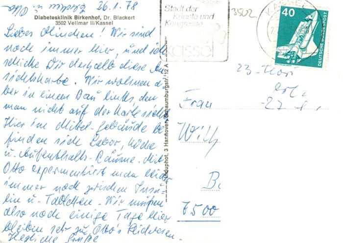 73935597 alte Postkarte Vellmar Diabetesklinik Birkenhof postalisch gelaufen Erhaltung siehe scans [FriedD77] KatCode: 11110006633026