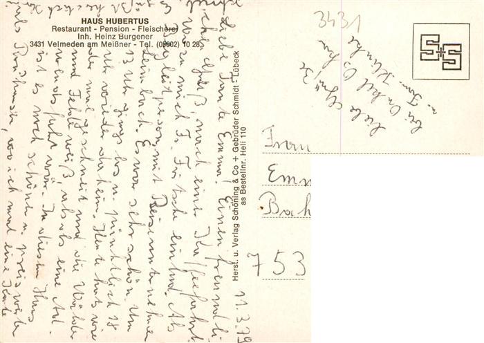 73937474 alte Postkarte Velmeden Witzenhausen Restaurant Haus Hubertus Gastraeume Panorama postalisch gelaufen Erhaltung siehe scans [WerneD78] KatCode: 11110006636006