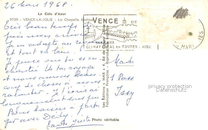 12966576 carte postale Vence-la-Jolie Chapelle Matisse postalisch gelaufen Erhaltung siehe scans [FriedD77] KatCode: 11170006106157