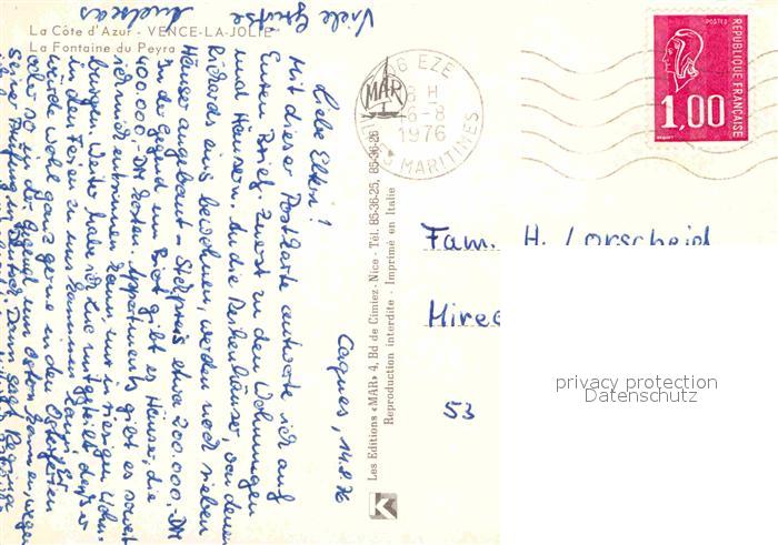 12904369 carte postale Vence-la-Jolie La Fontaine du Peyra postalisch gelaufen Erhaltung siehe scans [LiesaD40] KatCode: 11170006106157