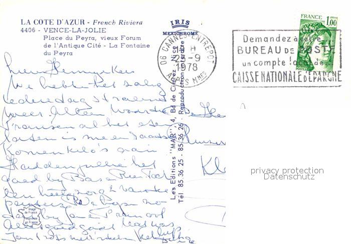12688755 carte postale Vence-la-Jolie Place du Peyra vieux Forum de l’Antique Cite Fontaine du Peyra postalisch gelaufen Erhaltung siehe scans [FriedD77] KatCode: 11170006106157