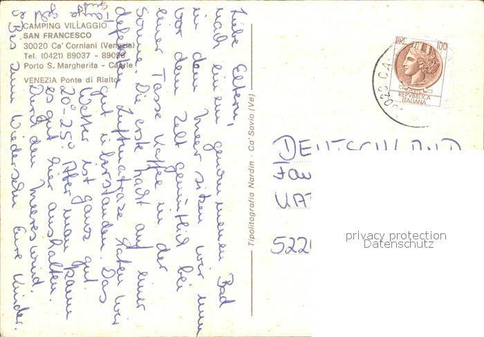old postcard Venezia Venedig Camping San Francesco Ponte di Rialto postalisch gelaufen Erhaltung siehe scans