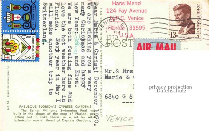 74118016 old postcard Venice Florida USA Floridas Cypress Gardens The Esther Williams Swimming Pool postalisch gelaufen Erhaltung siehe scans [WerneD78] KatCode: 14140110000000
