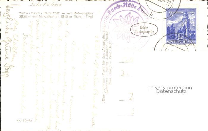 71566416 alte Postkarte Vent Tirol Martin Busch Huette mit Mutmalspitze Marzellspitze Alpenverein Schutzhuette oetztaler Alpen postalisch gelaufen Erhaltung siehe scans KatCode: 11390334070220