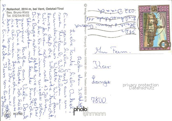 72288115 alte Postkarte Vent Tirol Rofenhof Wildspitze postalisch gelaufen Erhaltung siehe scans KatCode: 11390334070220