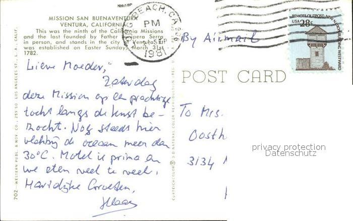 72272867 old postcard Ventura California Mission San Buenaventura postalisch gelaufen Erhaltung siehe scans KatCode: 14140050000000