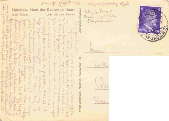 74034928 alte Postkarte Verlag HDK Haus der Deutschen Kunst Nr. 417 Muenchen Josef Thorak Leda mit dem Schwan postalisch gelaufen Erhaltung siehe scans [IrynaD87] KatCode: 22080000002400
