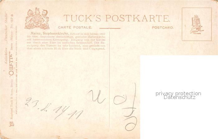 43259428 Verlag Tucks Oilette Nr. 187 B Mainz Stephanskirche Charles E. Flower postalisch nicht gelaufen Erhaltung siehe scans [PaolaD17] Paol Katcode 22080000002300