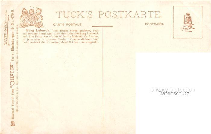 73890135 Verlag Tucks Oilette Serie Nr. Nr. 679 B. Burg Lahneck postalisch nicht gelaufen Erhaltung siehe scans [IrynaD87] KatCode: 22080000002300