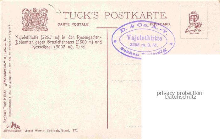74030115 Verlag Tucks Serie Nr. 771 Vajoletthuette Rosengarten Dolomiten Kesselkogl postalisch nicht gelaufen Erhaltung siehe scans [IrynaD87] KatCode: 22080000002300