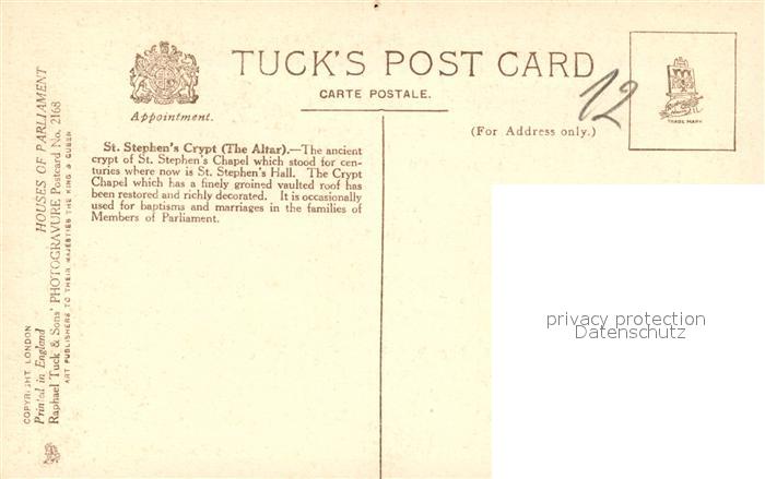 Verlag Tucks St. Stephen’s Crypt Altar postalisch nicht gelaufen Erhaltung siehe scans [PaolaD17]
