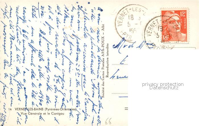 13483425 carte postale Vernet-les-Bains Vue Generale et le Canigou Pyrénées postalisch gelaufen Erhaltung siehe scans [FriedD77] KatCode: 11170066366222