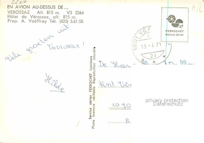 12665413 alte Postkarte Verossaz Fliegeraufnahme Hotel der Verossaz postalisch gelaufen Erhaltung siehe scans [LiesaD40] KatCode: 11470230735600