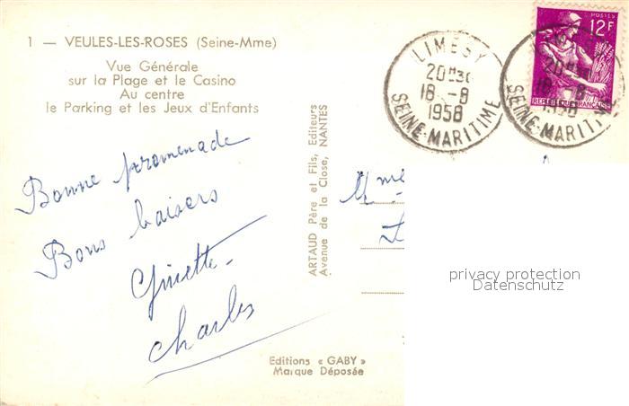 13590809 Veules-les-Roses Panorama Plage Casino Centre Parking Jeux d postalisch gelaufen Erhaltung siehe scans [KathaD81] carte postale Kath Katcode 11170076176735