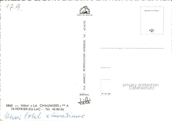 12016793 Veyrier-du-Lac Hotel La Chaumiere postalisch nicht gelaufen Erhaltung siehe scans KatCode: 11170074174299