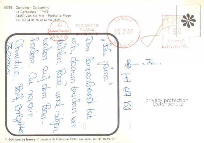 12892776 carte postale Vias-sur-Mer Camping La Carabasse postalisch gelaufen Erhaltung siehe scans [AndreD76] KatCode: 11170034134332