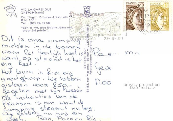 12688781 carte postale Vic-la-Gardiole Camping du Bois des Aresquiers Plage Restaurant postalisch gelaufen Erhaltung siehe scans [FriedD77] KatCode: 11170034334333