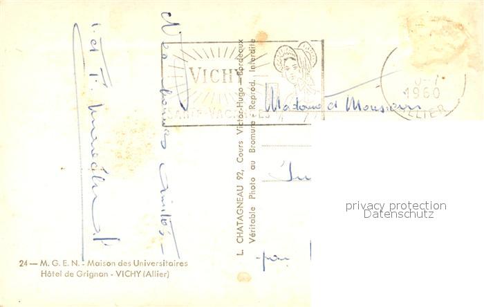13536993 carte postale Vichy Allier Hôtel de Grignon postalisch gelaufen Erhaltung siehe scans [FriedD77] KatCode: 11170003303310