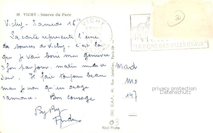 13493904 Vichy Allier Source du Parc postalisch nicht gelaufen Erhaltung siehe scans [WerneD78] KatCode: 11170003303310