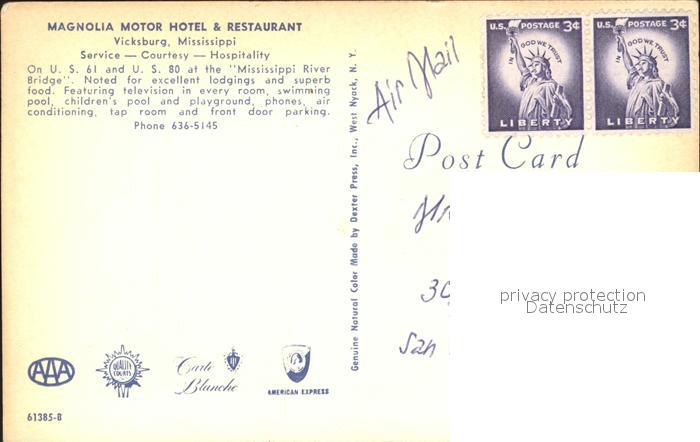 72167274 Vicksburg Mississippi Magnolia Motor Hotel and Restaurant postalisch nicht gelaufen Erhaltung siehe scans KatCode: 14140260000000