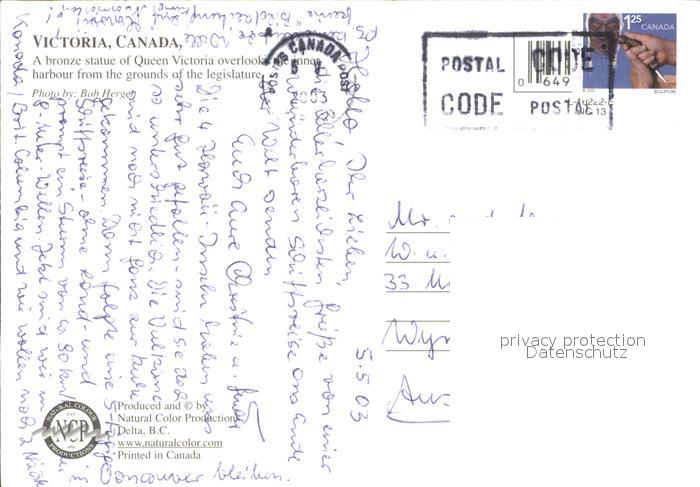 old postcard Victoria British Columbia Bronze statue of Queen Victoria Overlooking the inner harbour postalisch gelaufen Erhaltung siehe scans