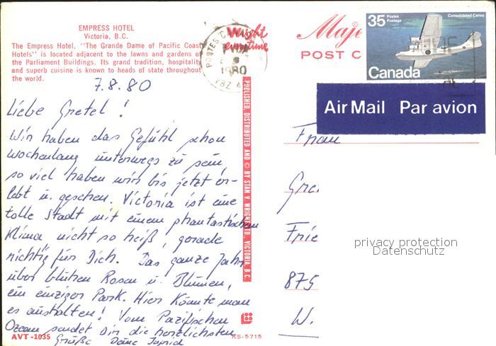 old postcard Victoria British Columbia Empress Hotel postalisch gelaufen Erhaltung siehe scans