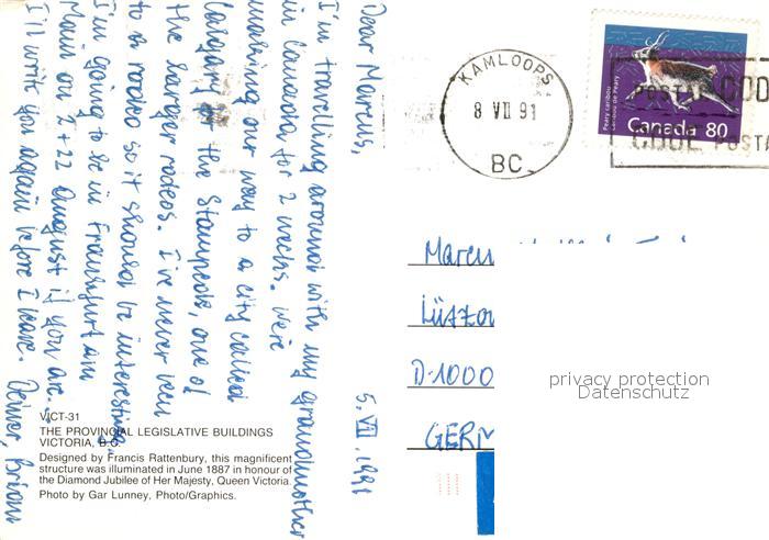 old postcard Victoria British Columbia Provincial Legislative Buildings postalisch gelaufen Erhaltung siehe scans [NatalD47]