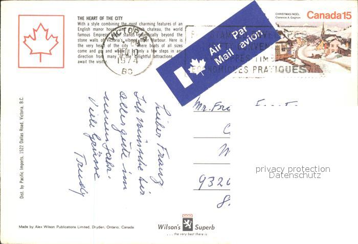 old postcard Victoria British Columbia The Empress Hotel on Inner Harbour postalisch gelaufen Erhaltung siehe scans