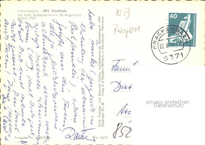 72922028 alte Postkarte Viechtach Bayerischer Wald Katholische Stadtpfarrkirche Sankt Augustinus Fliegeraufnahme postalisch gelaufen Erhaltung siehe scans [MatthD68] KatCode: 11110009276144