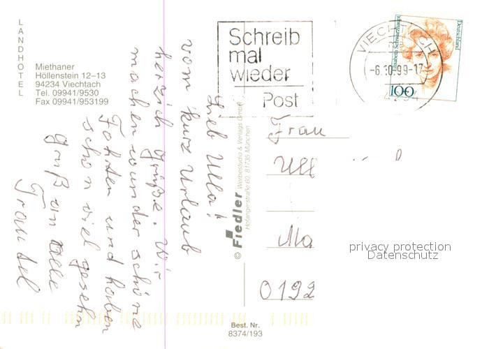 73725578 alte Postkarte Viechtach Bayerischer Wald Landhotel Miethaner Restaurant Terrasse Wassertreten Landschaftspanorama postalisch gelaufen Erhaltung siehe scans [FriedD77] KatCode: 11110009276144