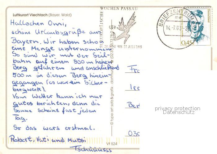 73735612 alte Postkarte Viechtach Bayerischer Wald Pfarrkirche Panorama Neunussberg Burgruine Hoellensteinsee Stadtplatz Schwimmbad postalisch gelaufen Erhaltung siehe scans [FriedD77] KatCode: 11110009276144