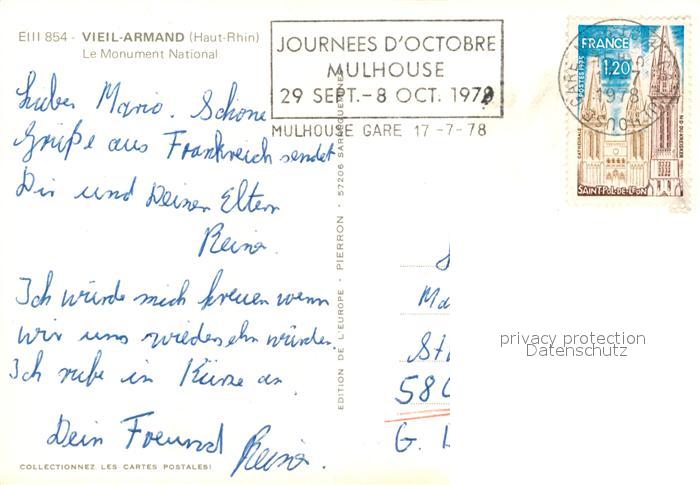 13054854 carte postale Vieil Armand Hartmannswillerkopf Le Monument National postalisch gelaufen Erhaltung siehe scans [WerneD78] KatCode: 1117006836812