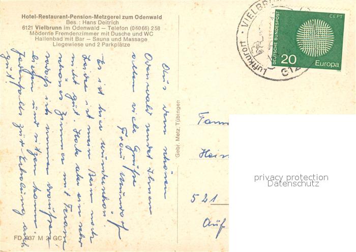 73664026 alte Postkarte Vielbrunn Hotel Restaurant Pension Metzgerei zum Odenwald postalisch gelaufen Erhaltung siehe scans [LiesaD40] KatCode: 11110006437011