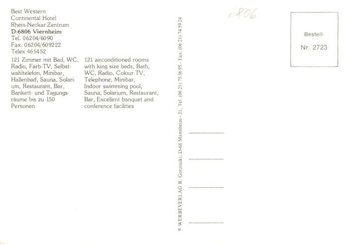 73891243 Viernheim Continental Hotel Gastraeume postalisch nicht gelaufen Erhaltung siehe scans [WerneD78] KatCode: 11110006431020