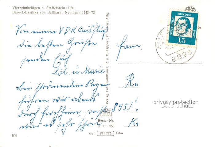 72953337 alte Postkarte Vierzehnheiligen Barock Basilika von Balthasa Neumann 18. Jhdt. Fliegeraufnahme postalisch gelaufen Erhaltung siehe scans [FriedD77] KatCode: 11110009478165