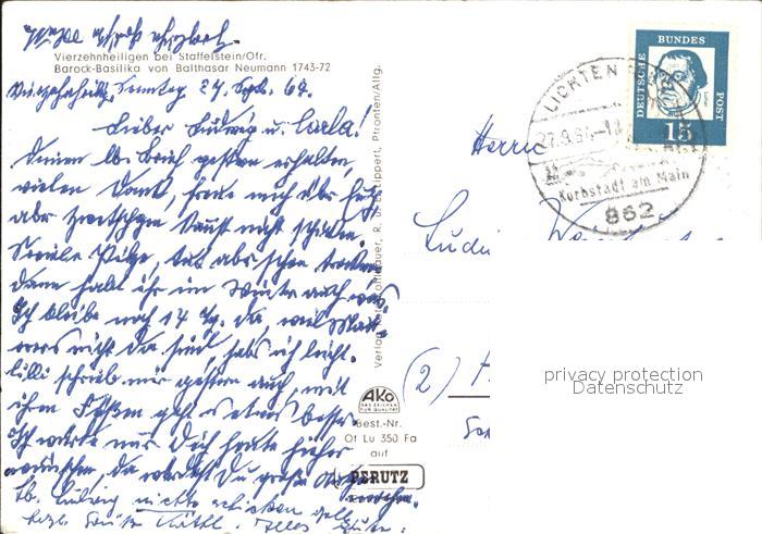 71948441 alte Postkarte Vierzehnheiligen Barock Basilika von Balthasar Neumann Fliegeraufnahme postalisch gelaufen Erhaltung siehe scans KatCode: 11110009478165