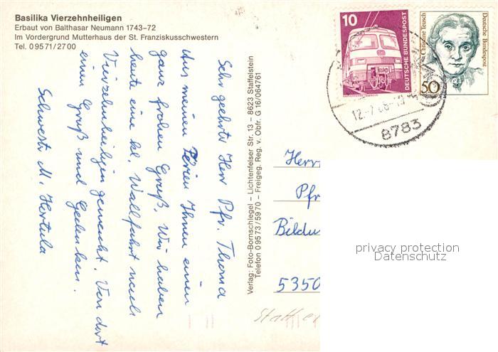 72991237 alte Postkarte Vierzehnheiligen Basilka Vierzehnheiligen mit Mutterhaus der St Franziskusschwestern postalisch gelaufen Erhaltung siehe scans [WerneD78] KatCode: 11110009478165