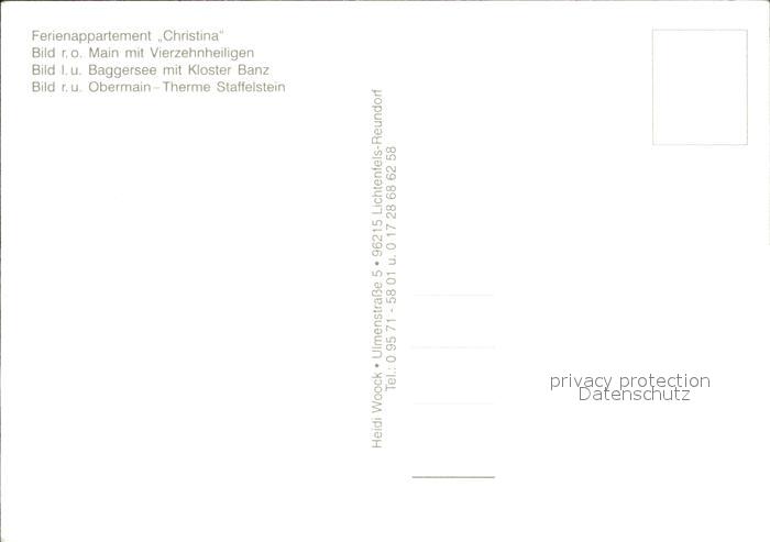 71866340 Vierzehnheiligen Ferienappartement Christina Main Baggersee Kloster Banz postalisch nicht gelaufen Erhaltung siehe scans KatCode: 11110009478165