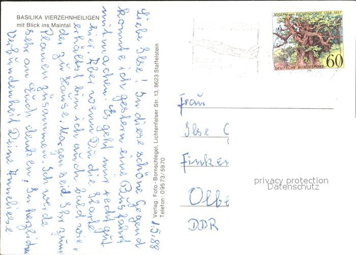 72275385 alte Postkarte Vierzehnheiligen Fliegeraufnahme Basilika mit Maintal postalisch gelaufen Erhaltung siehe scans KatCode: 11110009478165