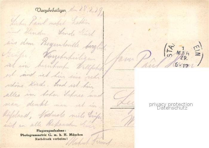 73111800 alte Postkarte Vierzehnheiligen Fliegeraufnahme postalisch gelaufen Erhaltung siehe scans [NatalD47] KatCode: 11110009478165