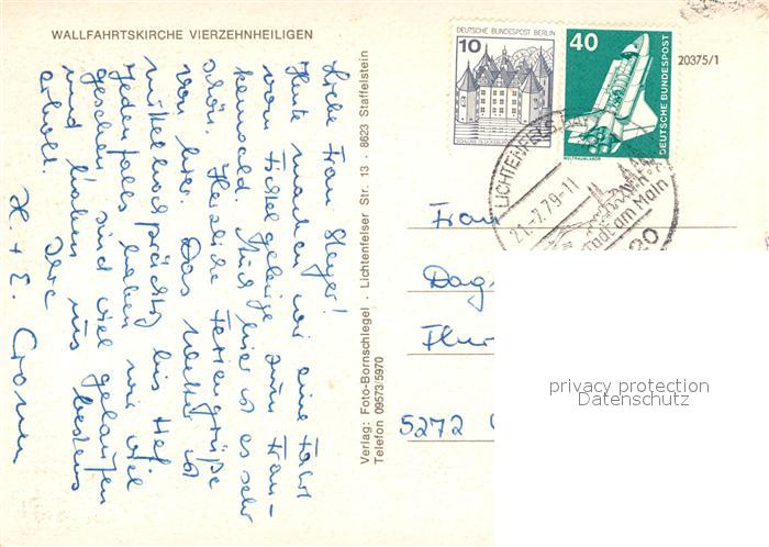 73015452 alte Postkarte Vierzehnheiligen Wallfahrtskirche Bayreuth Coburg Kronach Bamberg Staffelstein Schloss Banz Lichtenfels postalisch gelaufen Erhaltung siehe scans [WerneD78] KatCode: 11110009478165