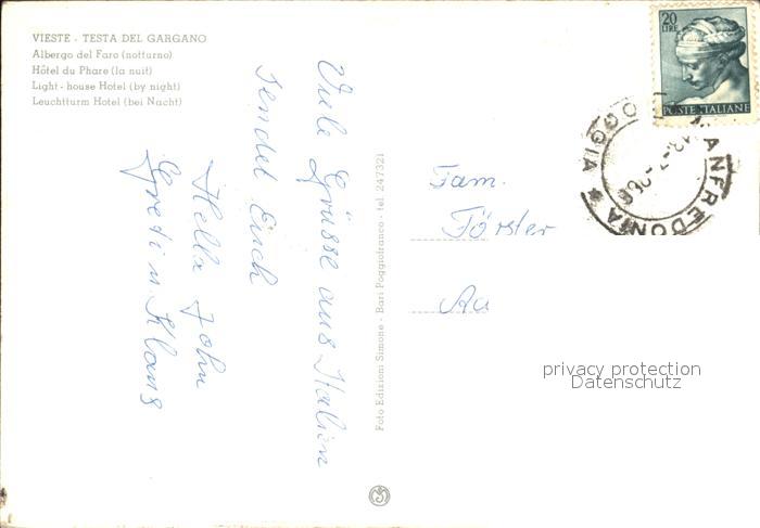 old postcard Vieste Foggia Leuchtturm Hotel bei Nacht postalisch gelaufen Erhaltung siehe scans