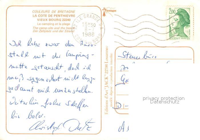 13657238 Vieux-Bourg Camping et la plage Côte de Penthievre vue aérienne postalisch gelaufen Erhaltung siehe scans [FriedD77] carte postale Frie Katcode 11170014314748