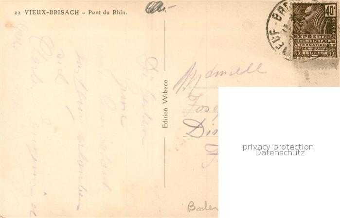 43510809 alte Postkarte Vieux Brisach Pont du Rhin Schiffsbruecke Blick zum Muenster postalisch gelaufen Erhaltung siehe scans [FriedD77] KatCode: 11110008315015