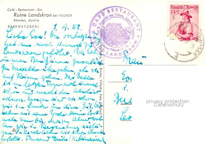 73054779 alte Postkarte Villach Kaernten Ruine Landskron Restaurant Baerenstueberl postalisch gelaufen Erhaltung siehe scans [WerneD78] KatCode: 11390211020201