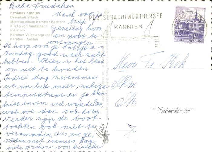 72310440 alte Postkarte Villach Kaernten Totalansicht Faehre Kirche Bildstock Folkloregruppe postalisch gelaufen Erhaltung siehe scans KatCode: 11390211020201