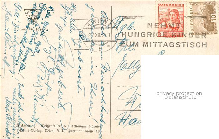 43037054 alte Postkarte Villach Kaernten Weissenfelser See mit Mangart Kuenstlerkarte Karte Nr 1626 postalisch gelaufen Erhaltung siehe scans [FriedD77] KatCode: 11390211020201